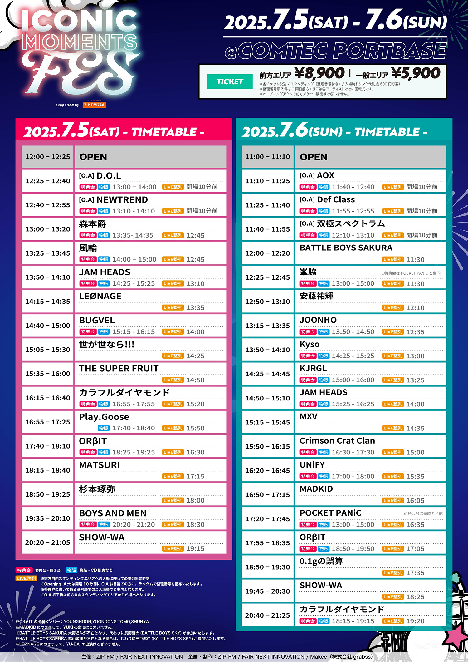本日タイムテーブル解禁いたしました! また物販・特典会情報も合わせて解禁いたしました。 ご来場前にご確認いただけますようお願いいたします。 また、チケット一般販売中ですので、お早めに!!